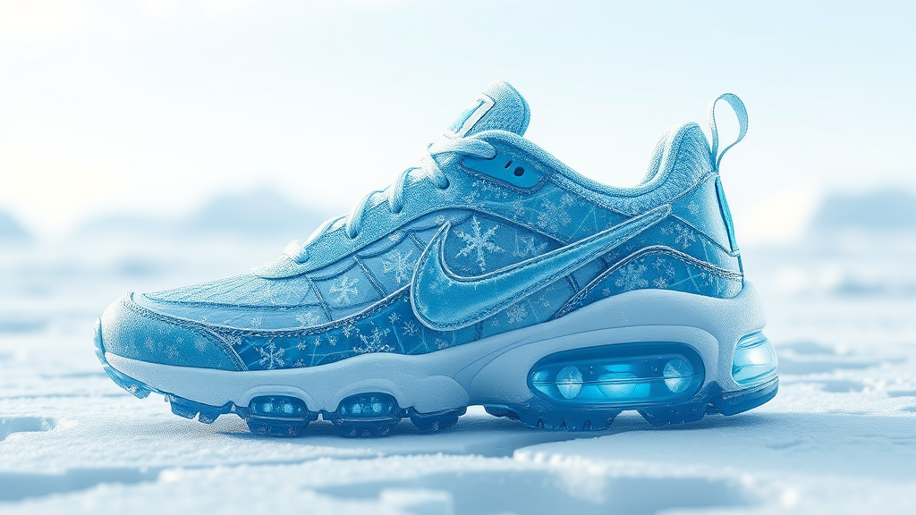 Sneaker design, Nike-themed, inspired by Frozen landscapes, intricately detailed, ultra-high resolution, 8k quality --ar 4:5, featuring icy blue hues and glimmering frost patterns, capturing the essence of glacial beauty and winter elegance.
