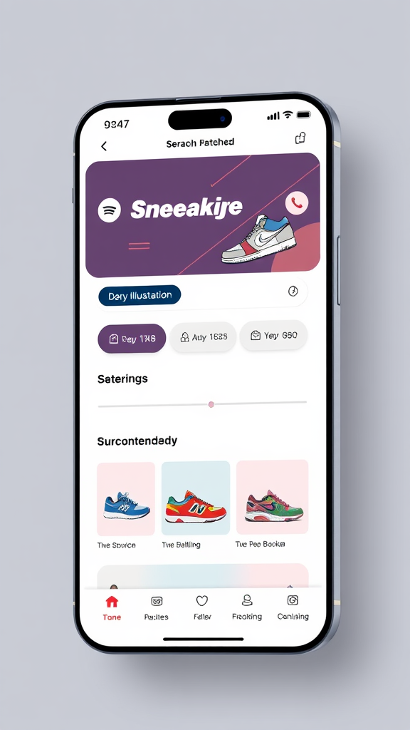 Sneaker store mobile app interface design, clean and modern aesthetic, emphasizing user-friendly navigation and vibrant product displays, 2D illustrations with minimalist icons, focus on smooth browsing experience, integrated search and filter options, visually engaging layout with bold typography, high-quality sneaker images, contemporary color palette, streamlined checkout process, personalized user recommendations.