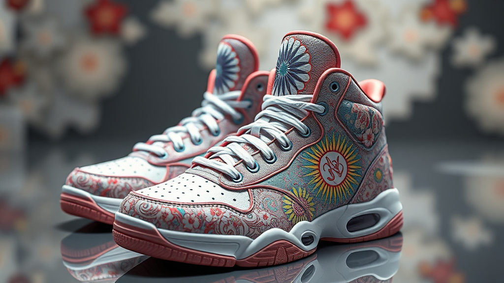 Sneakers envisioned by Takashi Murakami, featuring exquisite high-detail textures, intricate artistry, 3D rendered with Unreal Engine precision, enhanced by Octane Render for cinematic lighting, 8k resolution, vibrant color palette, subtle creative enhancements to merge traditional art with modern design aesthetics.