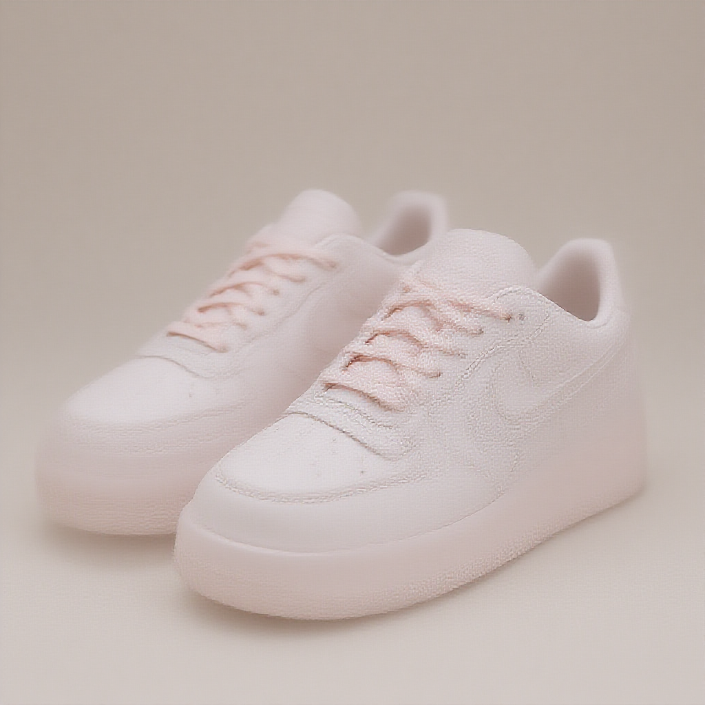 Sneakers featuring an embedded Nike logo, crafted with silicone soles and adorned in soft pastel hues, showcased in a well-lit fashion shoot. Designed by Craig Green, these shoes are captured in sharp focus with clear and detailed imagery, exuding a cinematic and futuristic aesthetic. The design is glamorous and symmetrical, suitable for a Vogue editorial fashion magazine shoot, with a glossy finish highlighting their modern appeal.