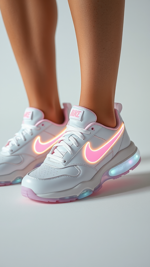 Sneakers featuring an embedded Nike logo, designed with silicone soles and adorned in soft pastel hues. The design is inspired by Craig Green's futuristic fashion aesthetic. Bright and evenly lit fashion shoot highlights the shoes with sharp focus and cinematic clarity, showcasing their detailed construction. The composition is symmetrical, exuding a glamorous, vogue-inspired editorial vibe perfect for a high-fashion magazine spread, with a glossy, polished finish that underscores a theme of modern futurism.