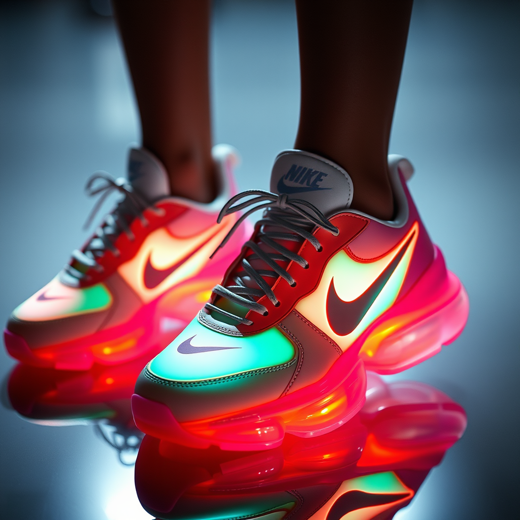 Sneakers featuring an embedded Nike logo on vibrant pastel silicone soles, designed by Craig Green, presented in a well-lit fashion shoot. The design is sharp-focused, highly detailed, and cinematic, exuding a futuristic and glamorous aesthetic. The composition is symmetrical, fit for a sophisticated vogue editorial, capturing a glossy, magazine-worthy allure with an emphasis on modern luxury and innovative style.