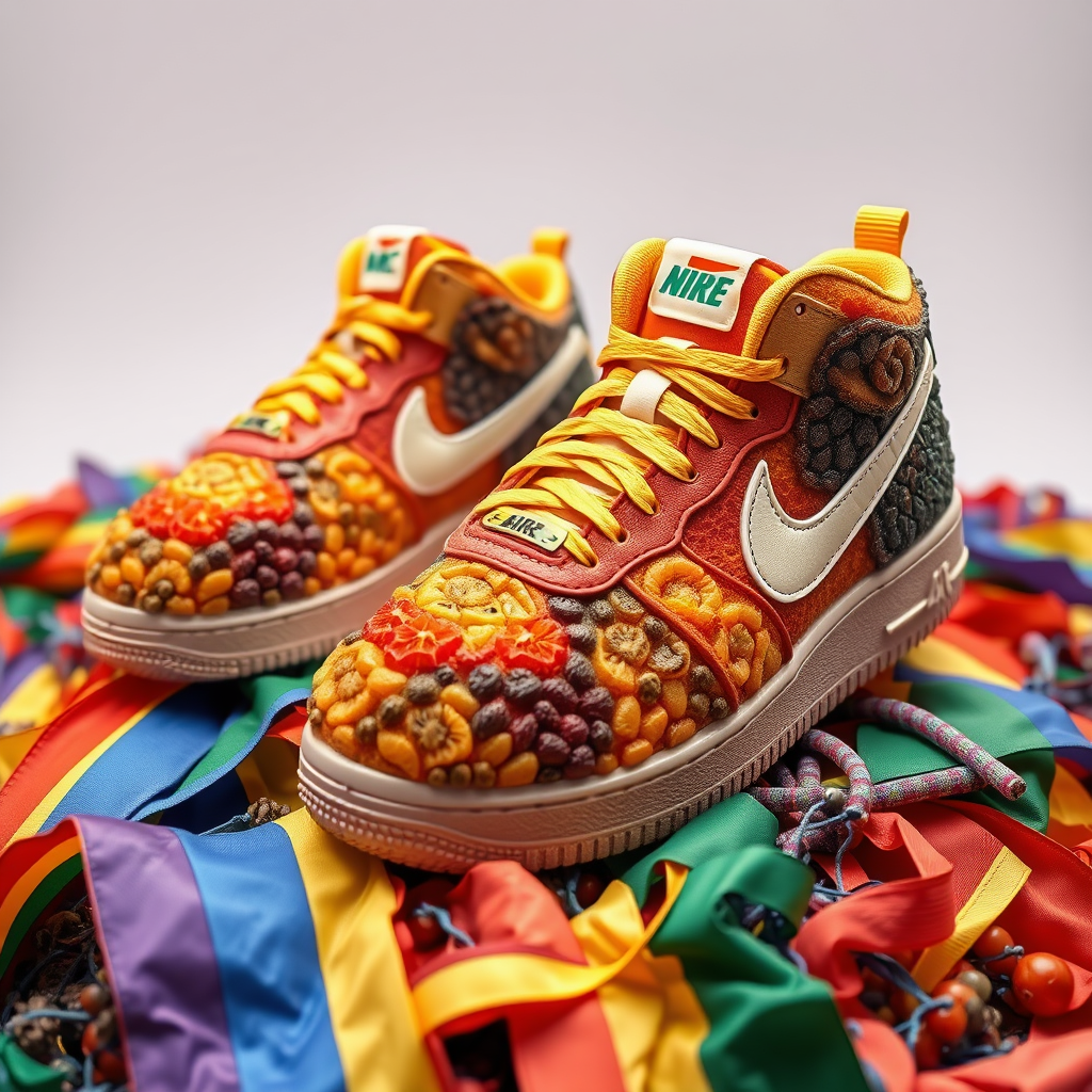 Sneakers inspired by Nike Airs crafted from vibrant dried fruit materials, embodying a futuristic solarpunk aesthetic with high detail and bright, vivid colors. The artwork features a clean composition and intricate detailing, presented as a stunning 3D render. These unique sneakers stand proudly on a textured pile of colorful Pride flags, showcasing a harmonious blend of nature and technology in a beautiful, imaginative masterpiece.