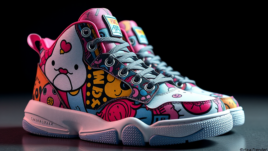 Sneakers inspired by Takashi Murakami design, featuring high-detail and intricate textures, 3D rendered with cinematic lighting, utilizing Unreal Engine and Octane Render for an ultra-realistic appearance in 8k resolution, showcasing vibrant colors and unique patterns with subtle creative twists, maintaining the original artistic essence and style.