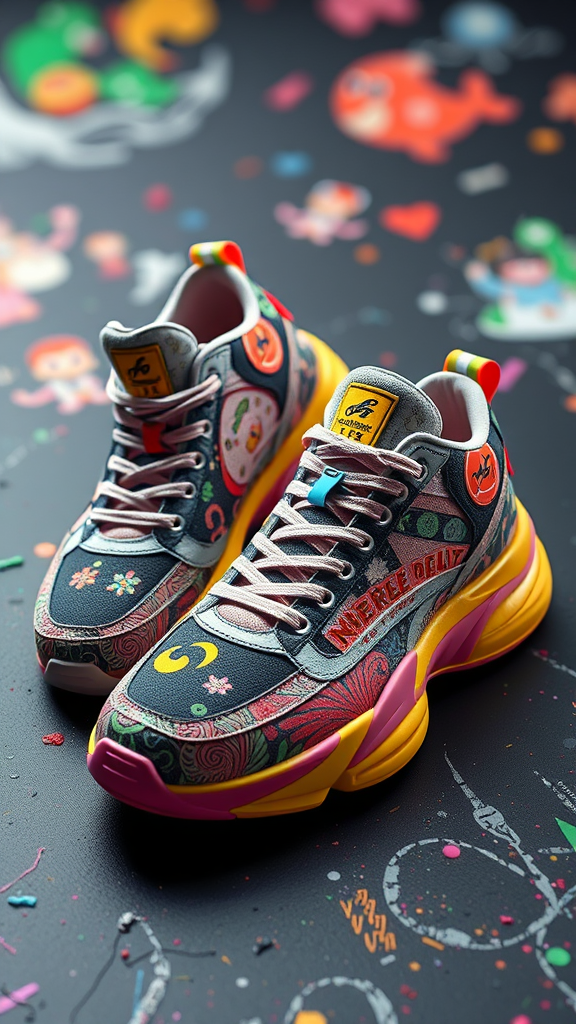 Sneakers inspired by Takashi Murakami, featuring elaborate high-detail textures, 3D rendering, crafted in unreal engine, octane render for cinematic illumination, 8k resolution, vibrant color palette, dynamic design elements, and artistic flair.
