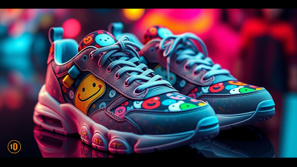 Sneakers inspired by Takashi Murakami, featuring exceptionally high detail and intricate textures, 3D rendered with cinematic lighting using Unreal Engine and Octane Render, capturing vibrant colors and playful motifs in stunning 8k resolution, combining art and fashion in a harmonious fusion of creativity and technology.