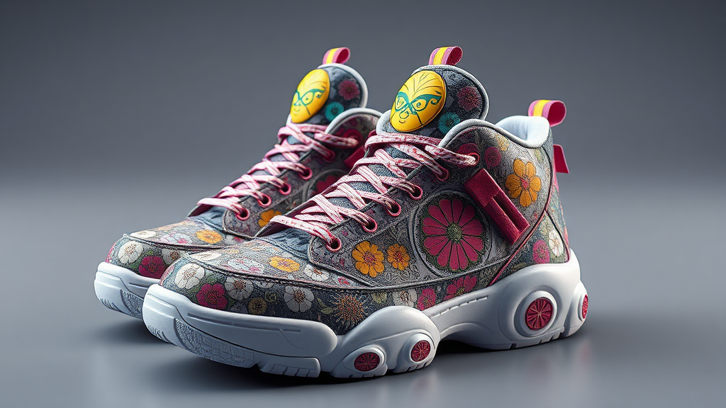 sneakers inspired by Takashi Murakami, featuring exquisite and elaborate textures, highly detailed 3d render, utilizing unreal engine and octane render for realistic cinematic lighting, 8k resolution, with vibrant colors and a whimsical touch, capturing a fusion of art and fashion elements.