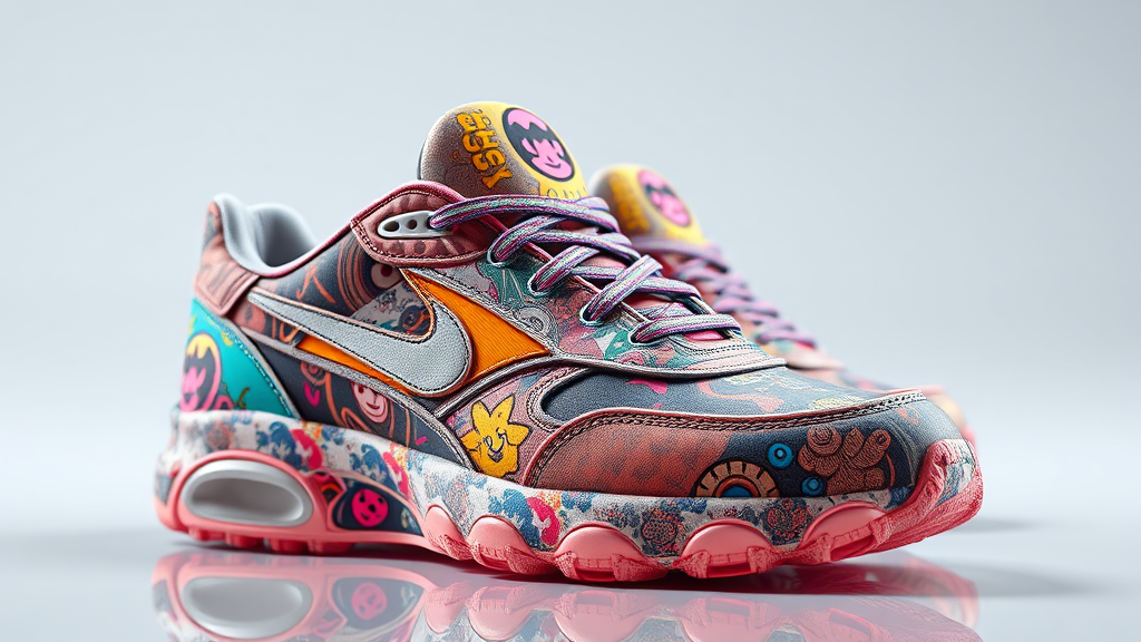 Sneakers inspired by Takashi Murakami, featuring highly detailed and intricate textures; 3D rendered with cinematic lighting in Unreal Engine and Octane Render; vibrant colors and patterns; 8k resolution; artistic fusion of contemporary art and modern streetwear aesthetics.