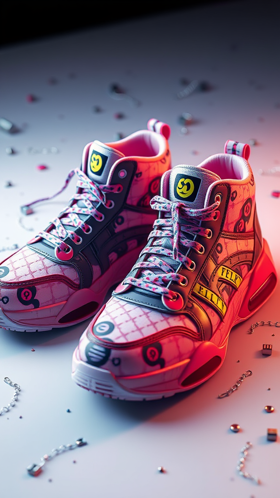 Sneakers inspired by Takashi Murakami, featuring high detail and intricate texture design, 3d render with an emphasis on vibrant colors and bold patterns, utilizing unreal engine and octane render for cinematic lighting effects, crafted in 8k resolution with subtle creative twists for a unique artistic expression --s 750 --q 2