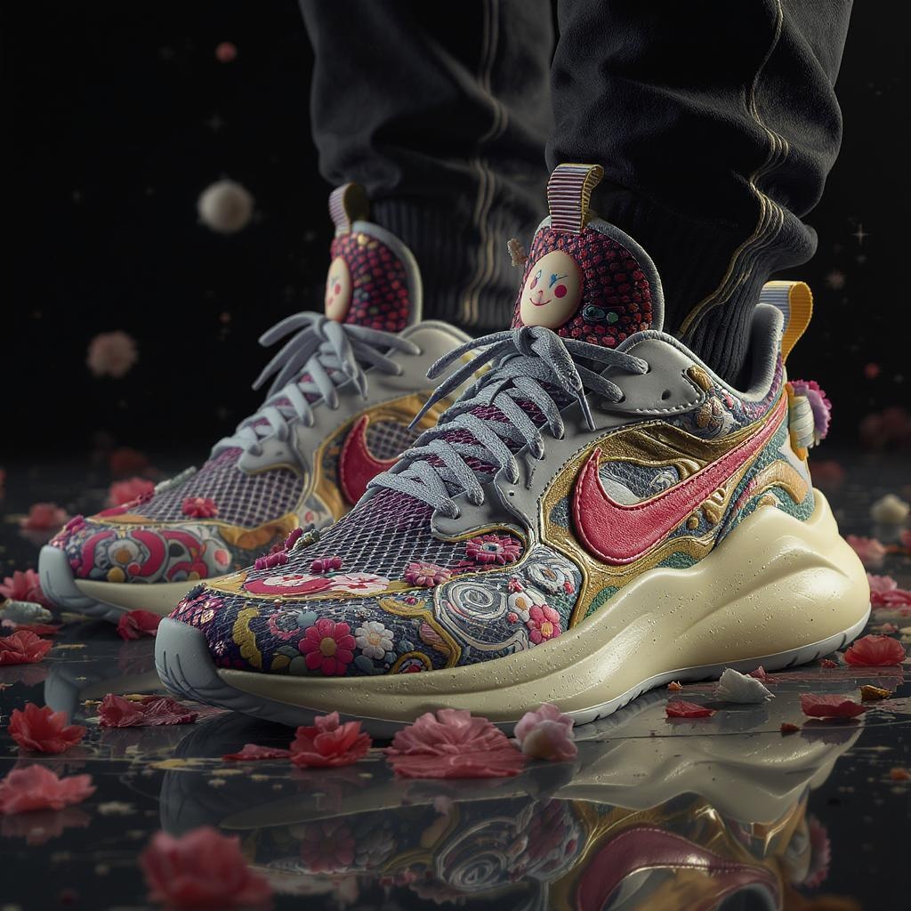 Sneakers inspired by Takashi Murakami, featuring high-detail and intricate textures, 3D rendered using unreal engine and octane render for cinematic lighting in 8k resolution, with vibrant colors and floral motifs, surreal elements intertwined with sleek modern aesthetics, pushing boundaries of art and design.
