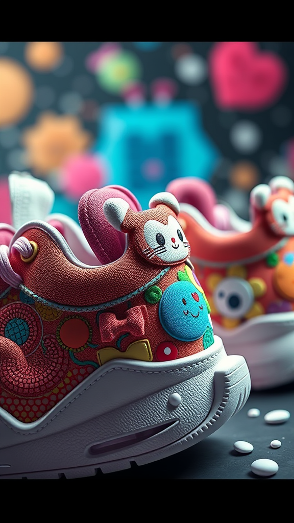 Sneakers inspired by Takashi Murakami, showcasing intricate textures and high-detail designs, 3D rendered with cinematic lighting, utilizing Unreal Engine and Octane Render technology for an 8k resolution visual masterpiece. Subtle creative elements include vibrant color palettes, whimsical motifs, and a seamless fusion of art and fashion, all enhanced by dynamic lighting effects to emphasize depth and richness.