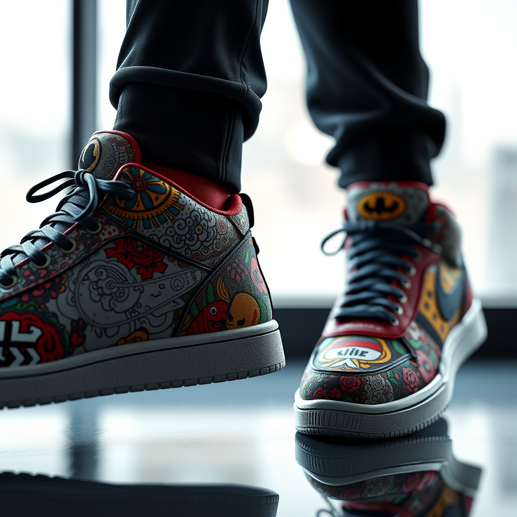 Sneakers inspired by Takashi Murakami's style, featuring intricate and high-detail texture, rendered in 3D with Unreal Engine and Octane Render. Incorporating cinematic lighting and showcasing vibrant, colorful designs emblematic of Murakami's aesthetic. Captured in ultra-high definition, 8k resolution, with a touch of modern elegance and artistic flair.