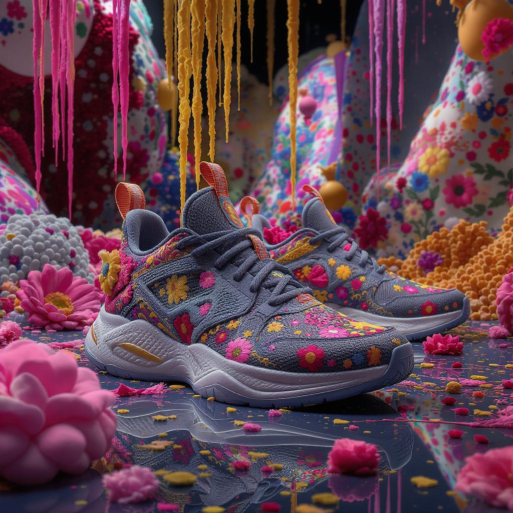 View this AI-generated image featuring sneakers inspired by the vibrant artistry of takashi murakami showcasing high detail and complex textures rendered in 3d utilizing unreal engine and octane render for cinematic 8k visuals the design features intricate floral patterns bold colors and a dynamic f