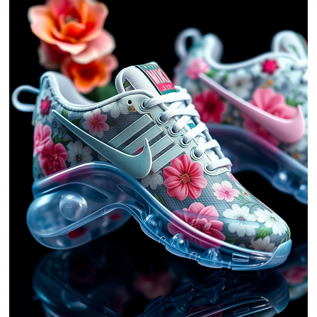 Sneakers with translucent silicone soles featuring the iconic Nike logo subtly embossed in the design, adorned with intricate patterns of blooming flowers, exuding vibrant colors and delicate details. The upper part of the shoe showcases a seamless blend of technology and nature, bringing together modern style and botanical elegance, captured in ultra-high-definition, showcasing every artisanal detail in vivid clarity, with an aspect ratio of 4:5.