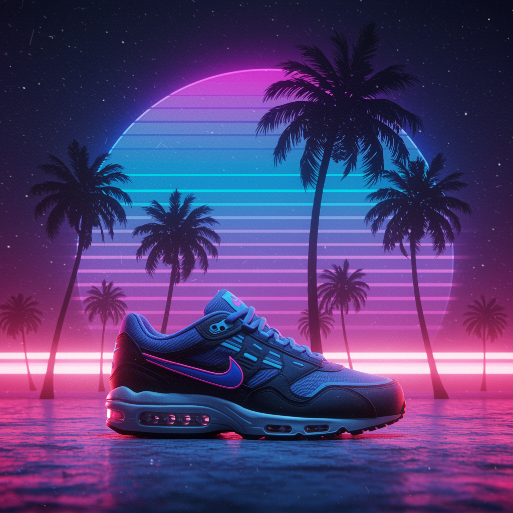 Sneakers with vibrant palm trees swaying softly in the backdrop, merging concept art influences of Dmitry Levitzky with the ethereal vibe of Grimes' Book 1 album cover. A fusion of art deco and outrun anime style brings a neon glow to the scene, mirroring the edgy aesthetics of Juxtapoz magazine. The design embodies the sleek, futuristic essence of Nike Air Max, where bold colors and dynamic lines create a harmonious yet electric composition.