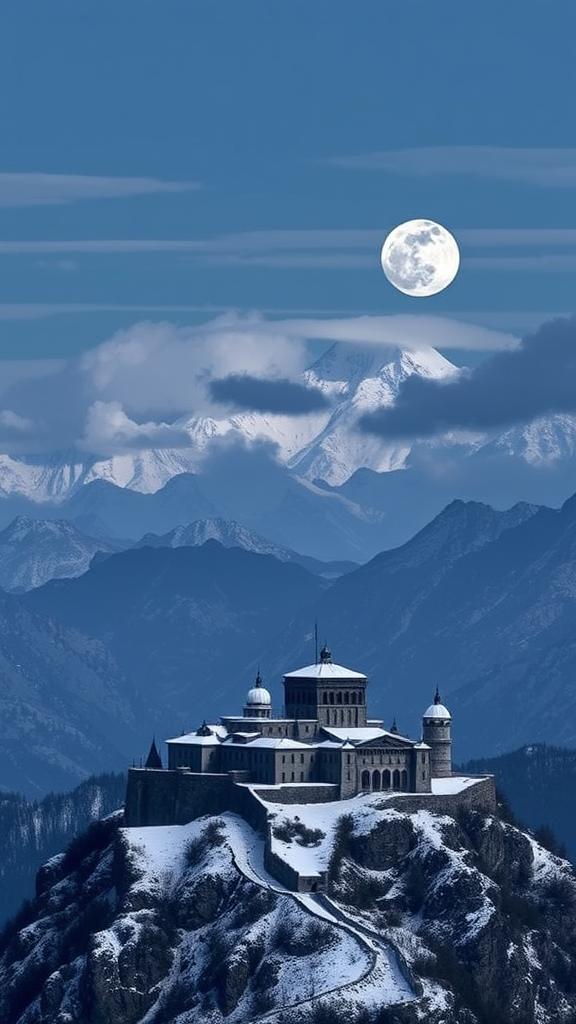 Snow-capped mountains rise majestically in the background, their peaks veiled by wispy clouds. The mountains are a deep, rich indigo color, with subtle hints of lavender and slate that shift and change with the light. They seem to stretch endlessly, creating a profound sense of depth and scale that irresistibly draws the eye. The scene's lighting is soft and dreamlike, as the full moon casts a silvery glow over everything. This moonlight highlights the intricate textures and delicate details of the ancient fortress and the surrounding landscape, adding depth and dimensionality. Shadows fall, deep and mysterious, tinged with subtle blues and purples, enhancing the enchanting atmosphere. The entire image exudes breathtaking beauty and wonder, with the majestic fortress and the spectacular natural landscape merging to evoke awe and enchantment.