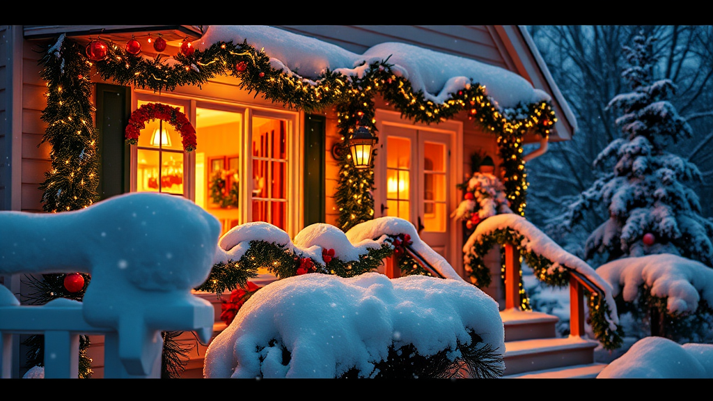 Snow-covered house adorned with twinkling lights and festive garlands, warm glow from windows illuminating a cozy interior, cinematic view captures vibrant ornaments reflecting gentle snowfall, HD quality.
