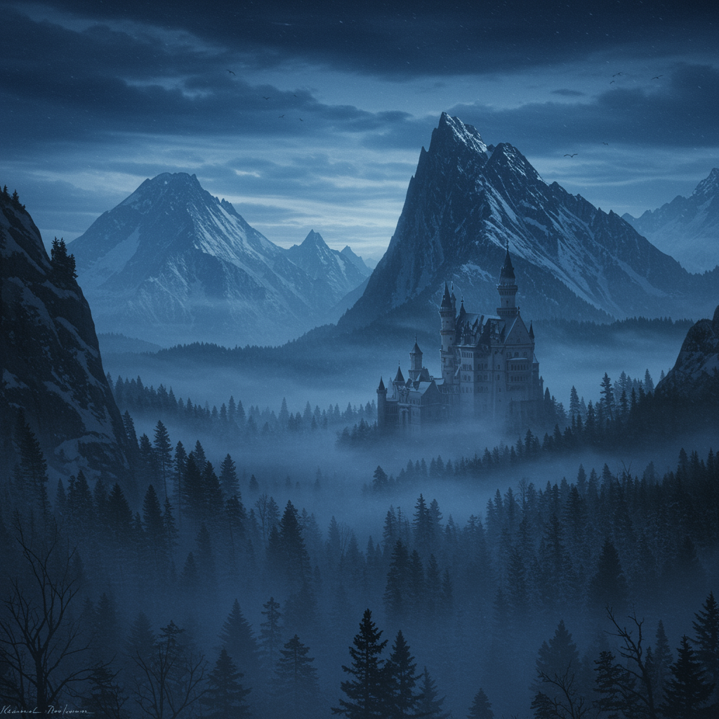 Snow-draped mountains tower in the distance, their peaks lost in the swirling mist. These majestic ranges are a profound, velvety indigo, with fleeting touches of lavender and slate that play with the shifting light. This seemingly endless expanse creates an immense sense of grandeur and depth, holding the viewer's gaze captive. The scene is bathed in a soft, ghostly luminescence, courtesy of a full moon casting its silvery light across the landscape. This moonlit glow highlights the delicate textures and intricate details of both castle and terrain, crafting a vivid sense of dimensionality. Deep, dark shadows cast a mysterious spell with their subtle blue and violet undertones, further enhancing the allure and magic. Altogether, the vista is one of mesmerizing beauty and wonder, as the noble castle and awe-inspiring natural surroundings blend into a spellbinding atmosphere of elegance and mystery.