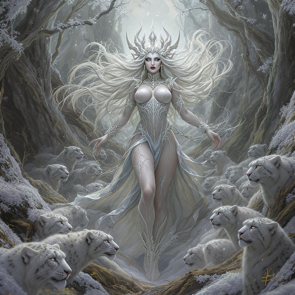 Snow leopard deity woman, digital painting, complete figure view, expansive shot, entire body, energetic stance, intense expression, silver hair, encircled by a multitude of snow leopards, captivating layout, hyper-realistic, concentrated, ultra-high definition, intricate detailing, exceptional artwork, panoramic perspective, aspect ratio 9:16, subtle creative twists, emphasizing distance, version 5.