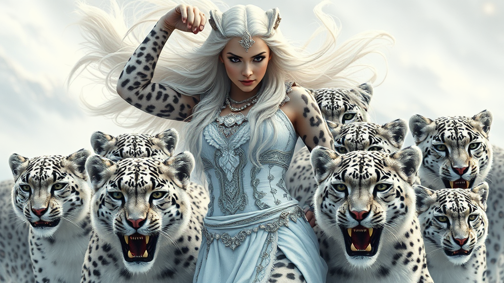 Snow leopard goddess woman, digital illustration, full body view, dynamic and commanding pose, intense and focused expression, flowing white hair, encircled by a majestic pack of snow leopards, interesting and captivating composition, photorealism, hyper-detailed, masterpiece quality, 8k resolution, wide-angle perspective, vivid realism, cinematic --ar 9:16 --s 500 --v 5