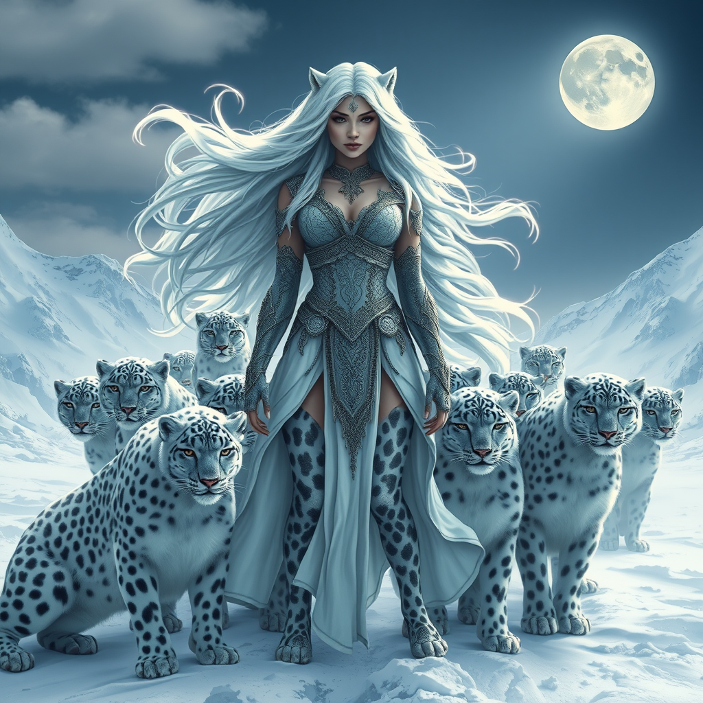 Snow leopard goddess woman, digital illustration, full body view, wide-angle shot, powerful stance, intense expression, flowing white hair, encircled by a pride of snow leopards, captivating composition, hyper-realistic, high-resolution 8k, intricately detailed, stunning masterpiece, expansive perspective, snowy landscape background, serene yet fierce ambiance, luminous moonlight over scene, mythical atmosphere.
