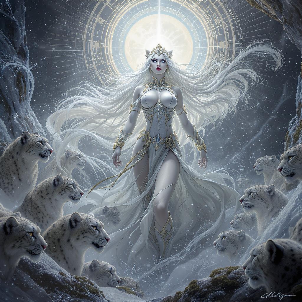 Snow leopard goddess woman in digital illustration, depicted in full body view with a wide-angle perspective. She strikes a dynamic pose with a determined and intense expression on her face. Her long, flowing white hair complements the ethereal aura around her. She is surrounded by numerous majestic snow leopards, each attentively poised, creating an intricate and captivating composition. The scene exudes photorealism, rendered with exceptional clarity and detail in 8k resolution, showcasing a masterpiece of artistry. The wide-angle view captures the full essence of her powerful presence in this stunning, super-detailed illustration.