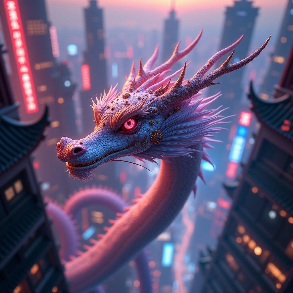 View this AI-generated image featuring a dragon soars through a modern cyberpunk fantasy world blending the stylized elegance of kyoto animation with the traditional beauty of chinese artwork the scene is illuminated with cinematic ethereal light that highlights the intricate elaborate details of th