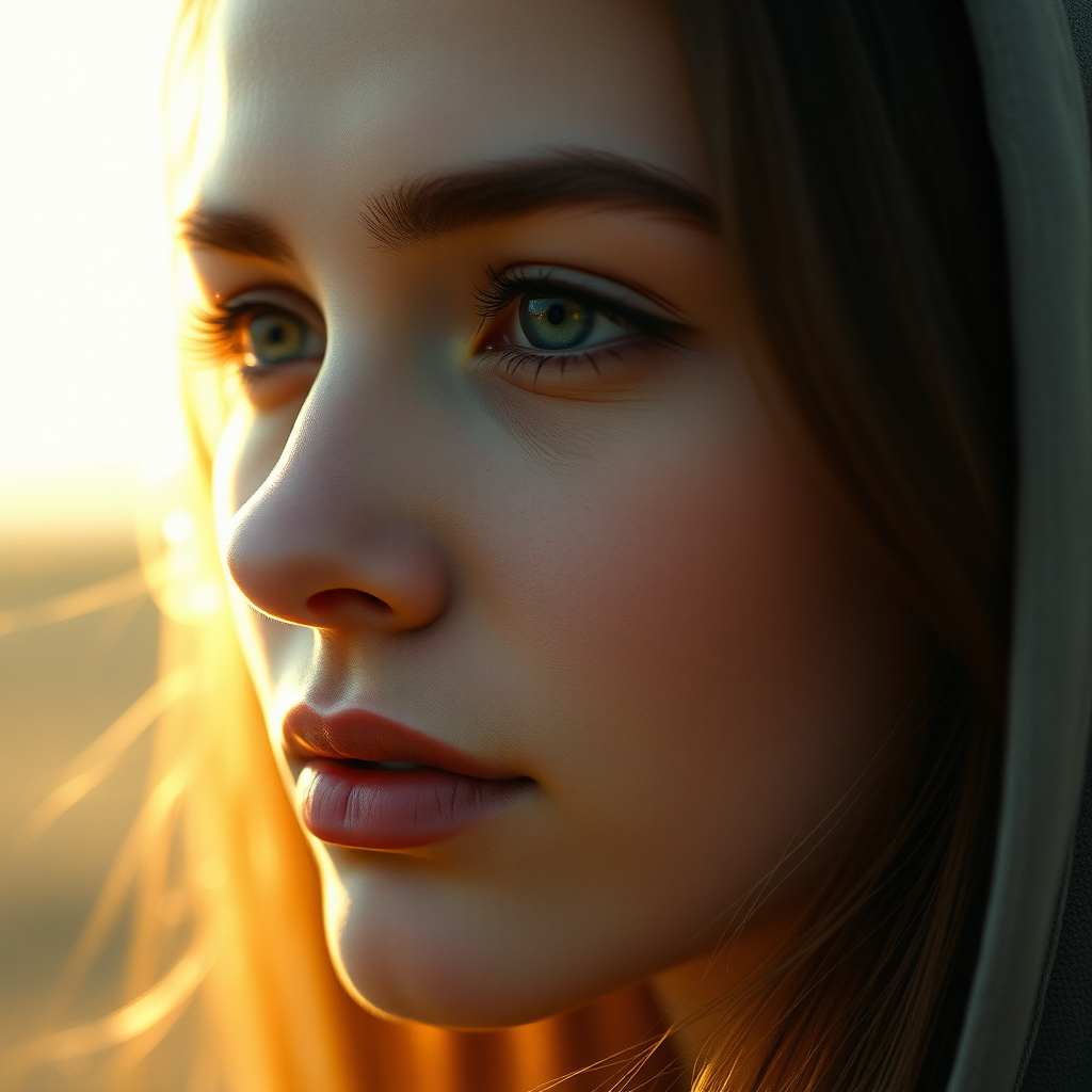Soft focus close-up of a young woman with a serene expression, gentle morning glow, high contrast film grain, granular texture, and vivid digital colors applied to digital painting, blending realistic and stylized elements.