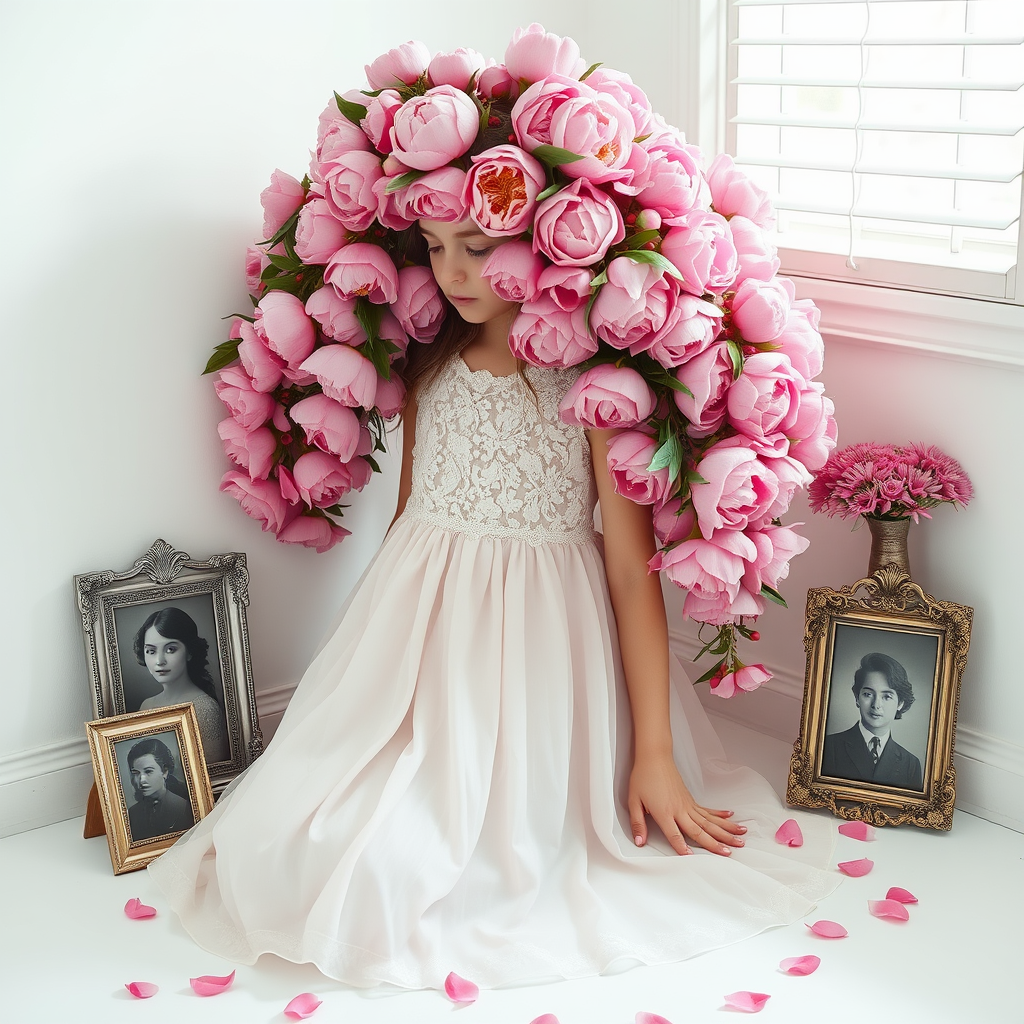 Soft-focus, high-contrast photograph of a girl in a flowing, pale pink dress with intricate lace details, her head and shoulders completely enveloped in a lush garland of fresh pink peonies, with subtle greenery and small red berries woven throughout, amidst a serene white minimalist background devoid of any prominent features or distractions, the atmosphere intimate and whisper-quiet, as if a summer morning in a Japanese garden, with sunlight trickling through the venetian blinds, filtering a soft glow over the girl, who appears lost in her own reverie, oblivious to the stunning backdrop that nearly swallows her whole, yet her features and the delicate folds of her dress remain crisp and distinct, like a ghostly apparition haunting the space, accompanied by two antique silver-framed photographs on nearby tables, one a vintage black-and-white portrait with a worn, cracked finish, the other a faded color snapshot in a distressed frame, both displaying subtle textures and hints of nostalgia, while the peonies languidly drop petals onto the pure white floor, in a perfect 4:5 aspect ratio, as if the photograph itself had been lovingly arranged in a celebration of the quiet, ephemeral beauty of summer.