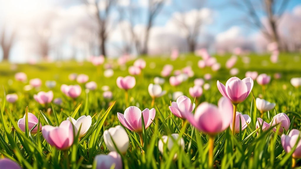 "Soft petals unfurl on verdant lawns as warm sunshine disperses chilling winter's hold, invigorating the air with sweet fragrance and electric blue clouds drifting lazily by, all set to an upbeat tempo in a heartwarming and colorful rendition of springtime joy"