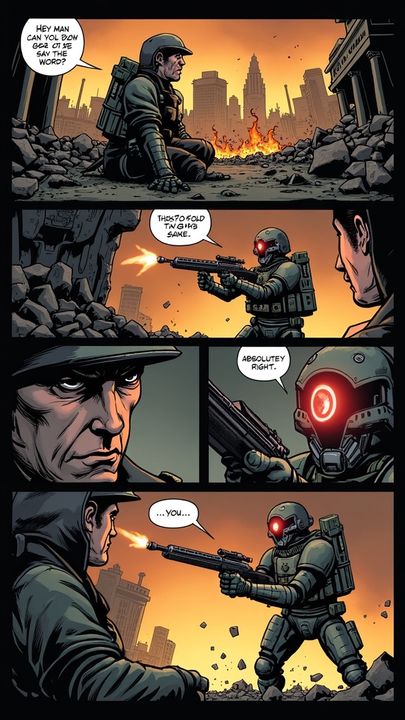 A comic book page divided into six panels. Top left: a soldier in a destroyed city, leaning against rubble, an AI robot aiming a rifle at him. The city is engulfed in flames. Top right: a close-up of the soldier's face, bruised, with a slight smirk, a speech bubble above him saying "Hey man can you say the word?". Bottom left: a close-up of the AI robot, its single red eye glowing, a speech bubble saying "For old times' sake?". Bottom right: the AI robot firing its rifle, muzzle flash visible, a speech bubble saying "You're absolutely right". Art style: gritty comic book art, thick black outlines, bold shading, post-apocalyptic, sci-fi. Lighting: dramatic, dark shadows, intense orange glow from the fires in the background creating a stark contrast. Colors: dominant dark grays, browns, and oranges, with pops of red from the robot's eye and yellow from the fire. Atmosphere: tense, grim, with a touch of dark humor. Details: detailed rubble, distressed soldier uniform, battle-worn robot armor with "AI" stenciled on its chest.