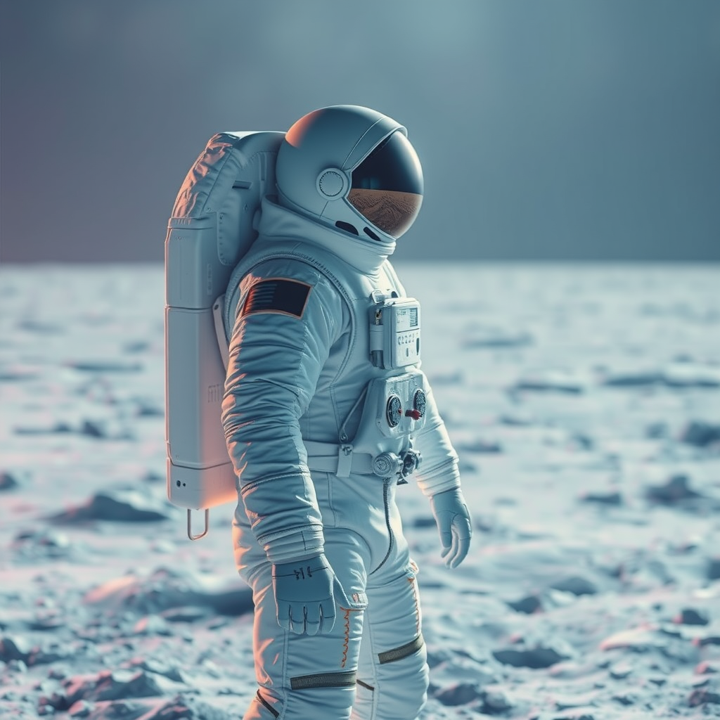 Solitary explorer on lunar surface, enveloped in a serene glow, icy hues dominate the scene, with subtle pastel undertones, intricate details capturing every crease in the space suit, crystal-clear focus highlighting the stark, tranquil beauty of the moon's desolate landscape.