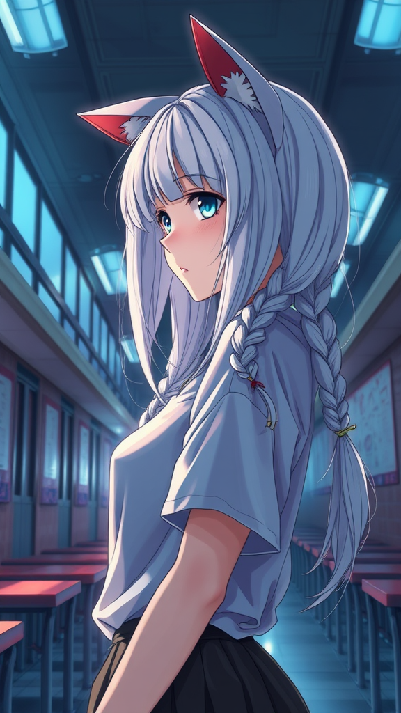Solo anime girl, full body, young adult, medium chest, hyperdetailed school background, school setting, meticulously braided medium white hair, cat ears, beautiful, detailed blue eyes, side view, torso shot from waist, thick lineart, anxious expression, hyperdetailed natural and reflection light, volumetric lighting, maximalist photo illustration, high resolution, intricately detailed complex design, vibrant, panoramic, cinematic, masterfully crafted, stunning, ultra detailed, expressive, colorful, rich deep color, vintage show promotional poster style, glamour, anime and fantasy art, dynamic brush strokes, ultra high definition, HDR, anime style photo, manga style, digital art, glow effects, hand-drawn, octane render, atmospheric dark mood, sharp focus, hyperrealistic, dramatic depth, masterpiece, vivid colors, modelshoot style, professional majestic oil painting inspired by Studio Ghibli, Jeremy Mann, Greg Manchess, Antonio Moro, trending on ArtStation and CGSociety, intricate, high detail, sharp focus, dramatic, photorealistic painting art by midjourney and Greg Rutkowski.