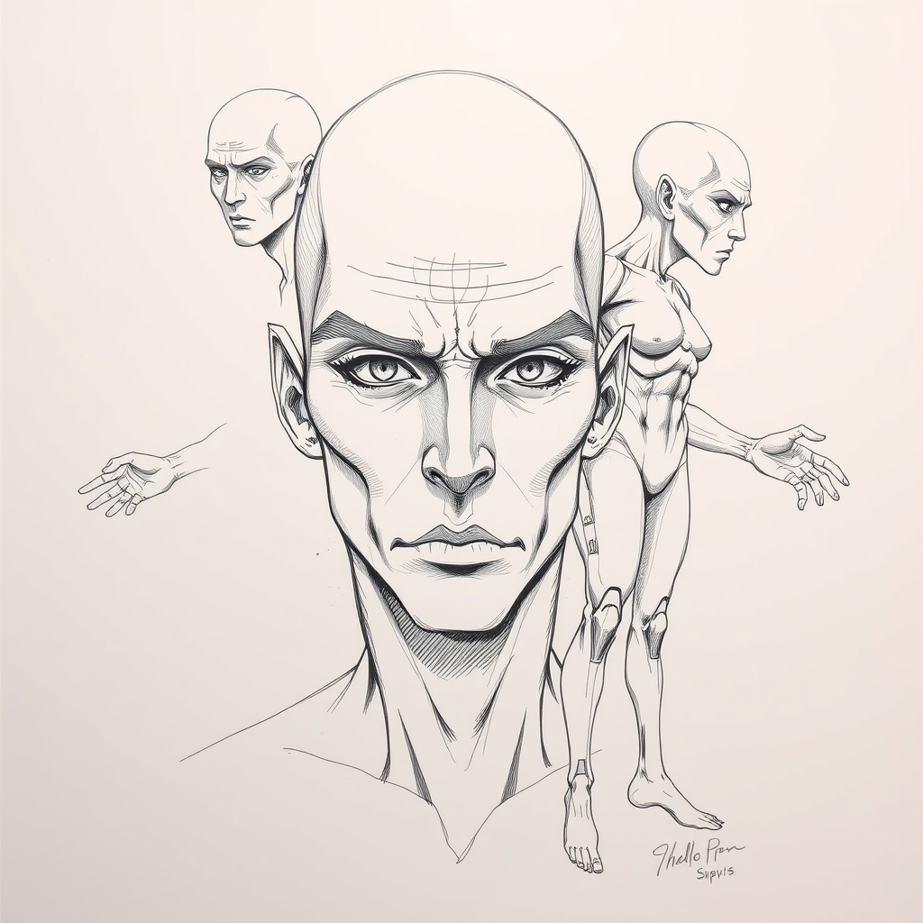 solo, perfect facial features, high-quality sketch, multiple perspectives, comic style, topless portrayal, duplicate figures, additional arms and legs, fused fingers, signature elements, text inclusion, flawed anatomy, creative distortions, intentionally challenging prompts