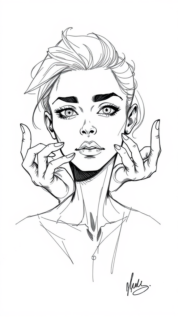 solo portrait comic-style sketch, emphasis on detailed face, exploring multiple perspectives, unique character design, minimalist approach, showcasing elements like extra arms or legs, playfully interacting with fused fingers concept, subtle integration of a signature, creative use of text elements, abstract anatomy exploration, maintaining an artistic balance with slight imperfections.