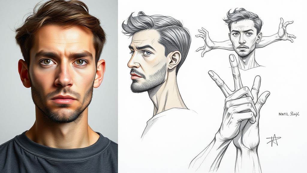 Solo portrait, high quality, flawless facial features, multiple angles, comic-style sketch, topless focus, additional perspectives, two individuals appearing, surplus arms and legs, merged fingers, signature and text elements, unique anatomy, challenging aesthetic, unconventional composition, explorative expression.