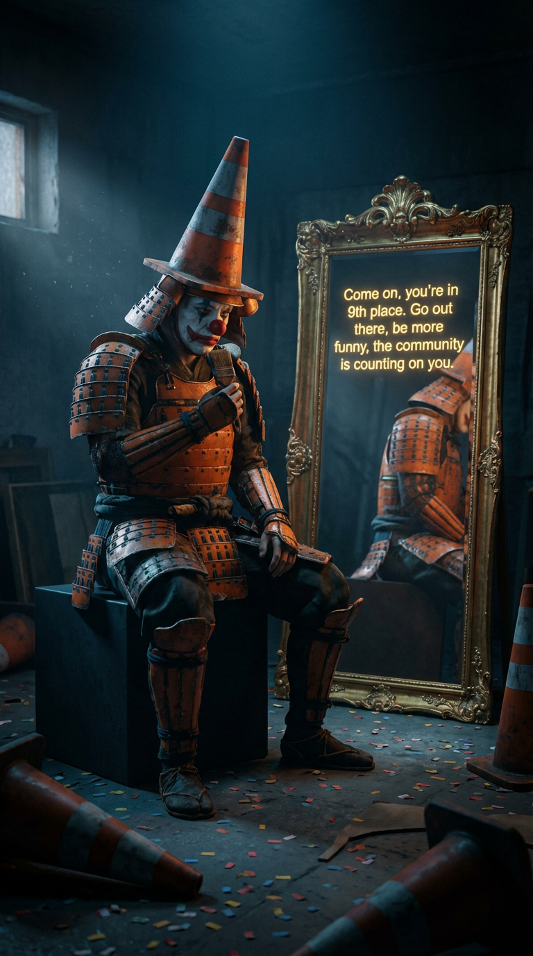 A surreal concept art image of a male figure in full orange samurai armor, wearing a clown's makeup with a traffic cone helmet, sitting on a dark cube. He is holding a small brush near his mouth. To his right, an ornate gold mirror reflects his armored back, displaying the text "Come on, you're in 9th place. Go out there, be more funny, the community is counting on you." The setting is a dimly lit, somber room with scattered confetti and traffic cones on the floor. Cinematic lighting, dramatic shadows, photorealistic, high detail, dark atmosphere, melancholic mood, deep blues and oranges.