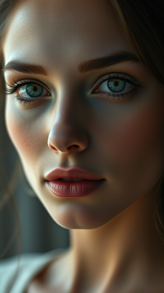Sophisticated photorealistic portrayal of a woman with delicate facial features and detailed eyes, featuring sharp realistic pupils. The full-body composition captures her with natural facelight enhancing her real, firm skin. The image includes ultra-detailed elements with a depth of field that emphasizes a soft bokeh background, adding an artistic touch while maintaining the core elegance and realistic presentation.