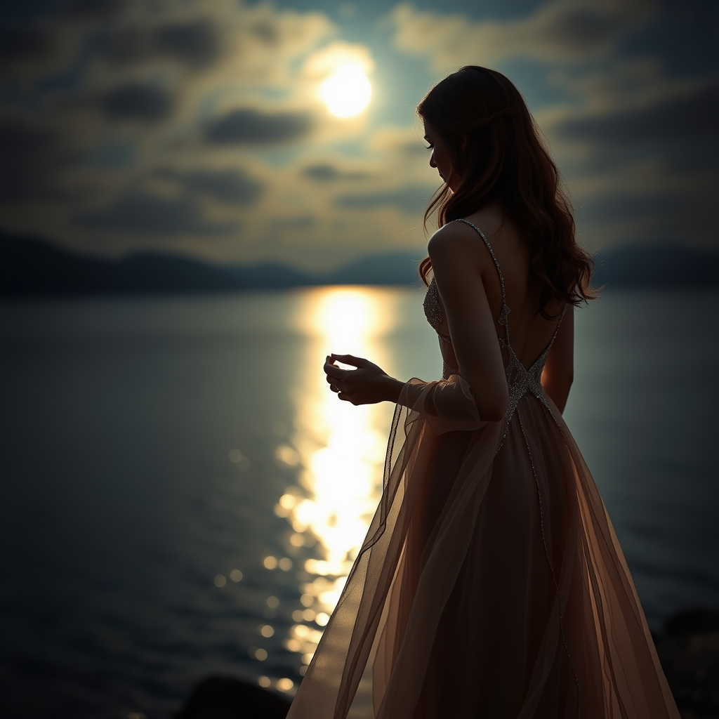 Sophisticated Ukrainian woman in a floor-sweeping, translucent evening gown, overlooks a serene, moonlit lake, shimmering with iridescent hues, delicate fingers tracing the contours of a shell, cinematographic, image shot on a 20mm lens, discretely blurred background, negligible depth of field, fusion of high and low-key lighting, perpetually suspended between shadows and illumination, alive with phrases and luminescent sparkles, sweeps of soft, dark gold hair, steady, enigmatic, perfectly proportioned, dimly lit figure absorbing an auroral glow, tenderly suffused with soft northern lights, fringes of ambient glow chiming softly into peaceful fields of partially cloudy darkness, graciously skirted with reserved movements and tenebrous ritual gestures.