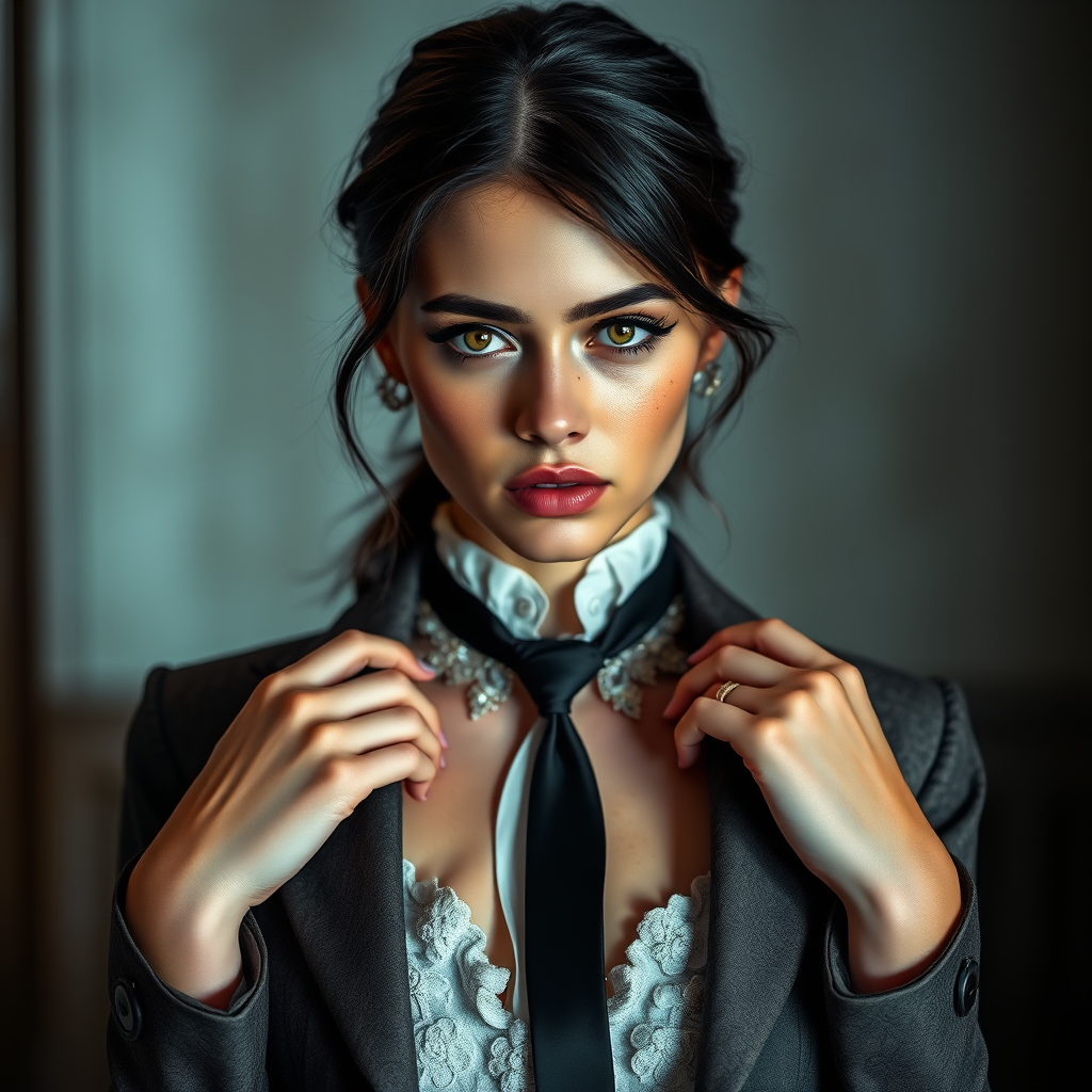 Sophisticated young woman dressed in an open blazer and tie, featuring intricate and elegant detailing. The image is cinematic, with dramatic and volumetric lighting, captured in an ultra-realistic, hyper-detailed style that is reminiscent of trending pieces on art platforms. Shot with a 150mm lens using octane render for a photorealistic effect. The photograph appears to have been taken with a Hasselblad H3DII camera, reflecting the artistic style of Seb McKinnon. Her eyes are a striking red, and her face is adorned with freckles and a slight rash. Despite capturing this expressive moment, elements such as text, watermark, and framing lead to common photographic imperfections. This includes potential errors like unnatural anatomy, hands with missing or extra fingers, or cropped limbs. The overall result maintains an artistic flair despite jpeg artifacts, signatures, and unintended blur, aligning with both high-res clarity and typical photographic challenges.