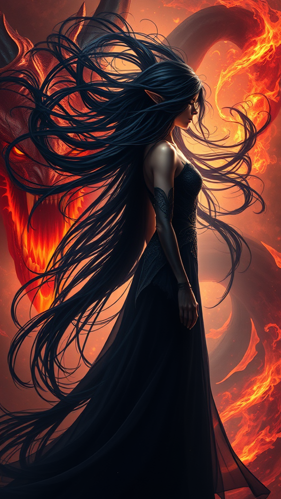 Sorceress with flowing ebony hair standing before an intimidating demon, fantasy art, hair forming swirling patterns like tendrils of smoke, epic fantasy card game illustration, woman enveloped in dark, ethereal flames, mystical side profile of a shadowy enchantress, UHD 4k resolution, dramatic and dynamic lighting effects, masterfully crafted visual narrative.