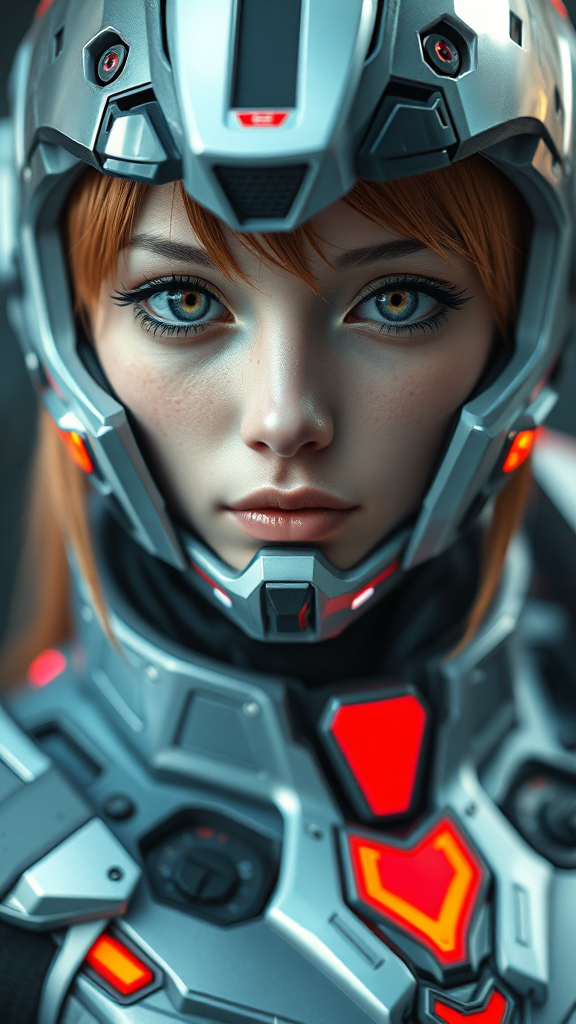 Souryuu Asuka Langley in futuristic sci-fi armor, ultra-realistic 8K CG photo, high detail, vivid colors, depicting beautiful, expressive eyes, rendered with physics-based techniques for cinematic lighting. The image strives for hyperrealism, capturing the essence of photography through CGI. The character is presented in a highly detailed, lifelike manner with perfect anatomy and proportions, avoiding any deformations or unnatural features. The composition emphasizes elegant design and stunning realism, focusing on the subject with no distracting elements or errors.