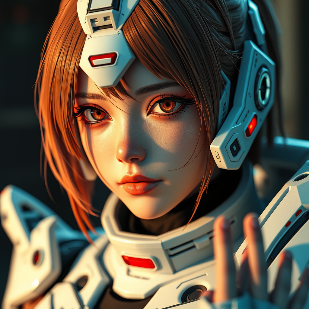 Souryuu Asuka Langley wearing futuristic sci-fi armor, captured in an 8k high detail RAW color photo, showcasing a realistic and highly detailed CG wallpaper. Utilizing physics-based rendering with cinematic lighting, emphasizing her beautifully detailed eyes. The image exemplifies ultra-high resolution and photorealism, produced with cinematic lighting techniques in CGI and 3D modeling. The composition avoids low quality elements such as blurriness, text, cropping, jpeg artifacts, and ensures a focus on perfect anatomy and proportion, omitting any deformities, mutations, or extra limbs. The result is a stunning, lifelike representation with seamless realism and intricate detail, avoiding any imperfections in hand or facial features.