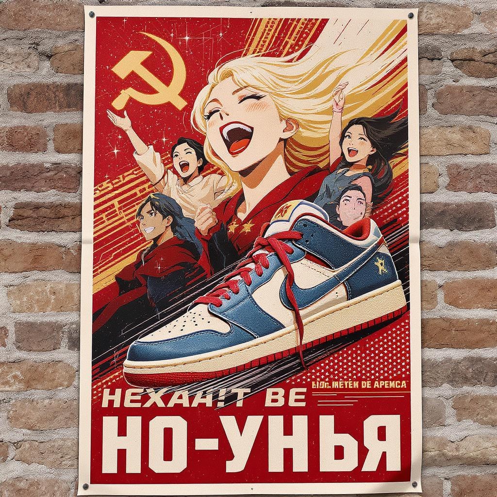 Soviet-inspired sneaker design poster showcasing a propaganda style infused with anime elements, featuring offset printing and intricate details. The composition exudes a vibrant and celebratory atmosphere with happy expressions, capturing the essence of the USSR posters. Rendered in high-definition 8K with CMYK colors, the design accentuates natural lighting to enhance the dynamic and bold imagery. The poster embraces a 2:3 aspect ratio, integrating creative elements to maintain the core concept while offering unique visual twists.