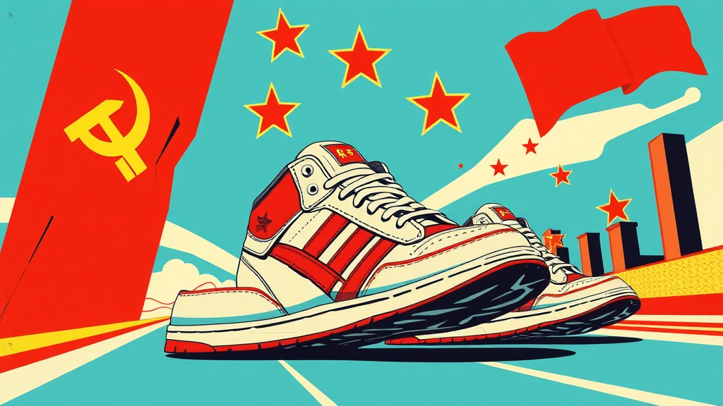 Soviet-inspired sneaker poster design, featuring bold, angular lines and vibrant colors reminiscent of classic USSR propaganda. Infused with anime elements for dynamic character presence, the design showcases high-detail offset printing techniques, creating a textured, layered look. The composition captures a sense of movement and progress with stylized sneakers as focal points, set against a backdrop of iconic Soviet motifs. Bright, natural lighting enhances the cheerful and optimistic tone, while maintaining a resolution of 8K HD in CMYK color profile, resulting in a striking and uplifting visual narrative.