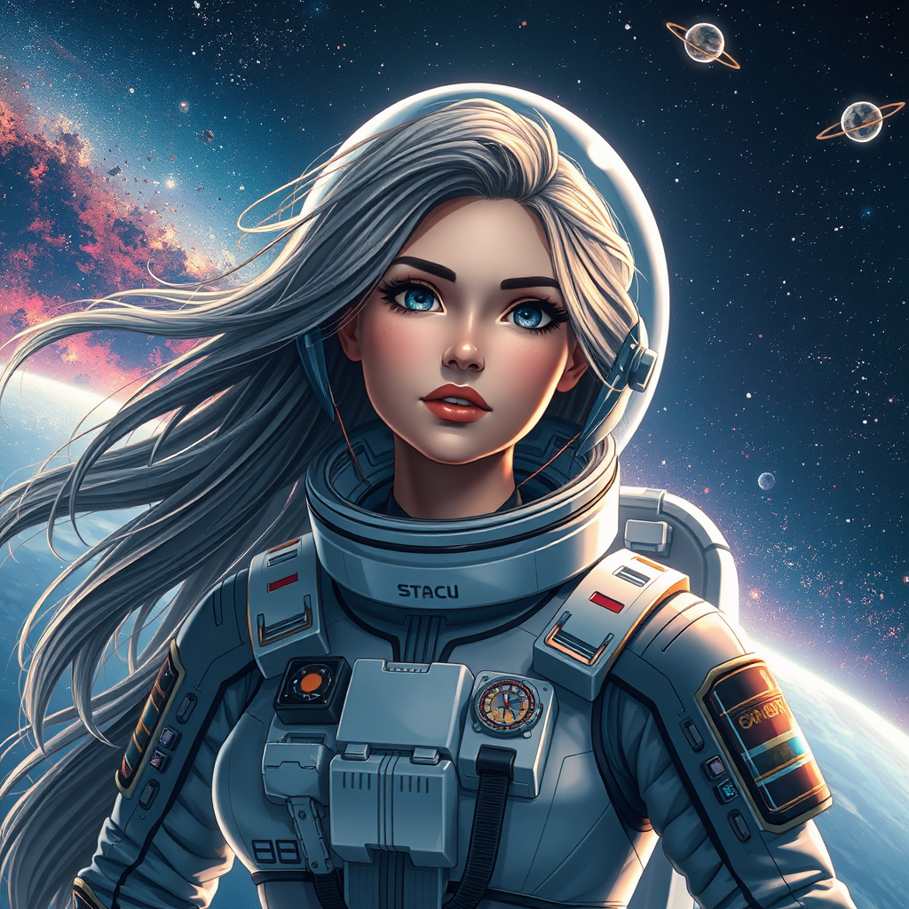 Space-faring woman in a retro-futuristic space suit, character portrait amid cosmic background, space art with high detailed official artwork; her flowing hair resembling the Milky Way, blending seamlessly with the cosmic surroundings; an imaginative fusion of hyperrealism and dynamic lighting; a 3D concept with cartoon and anime elements; enhanced by artistic sketches to capture the essence of her stellar journey.