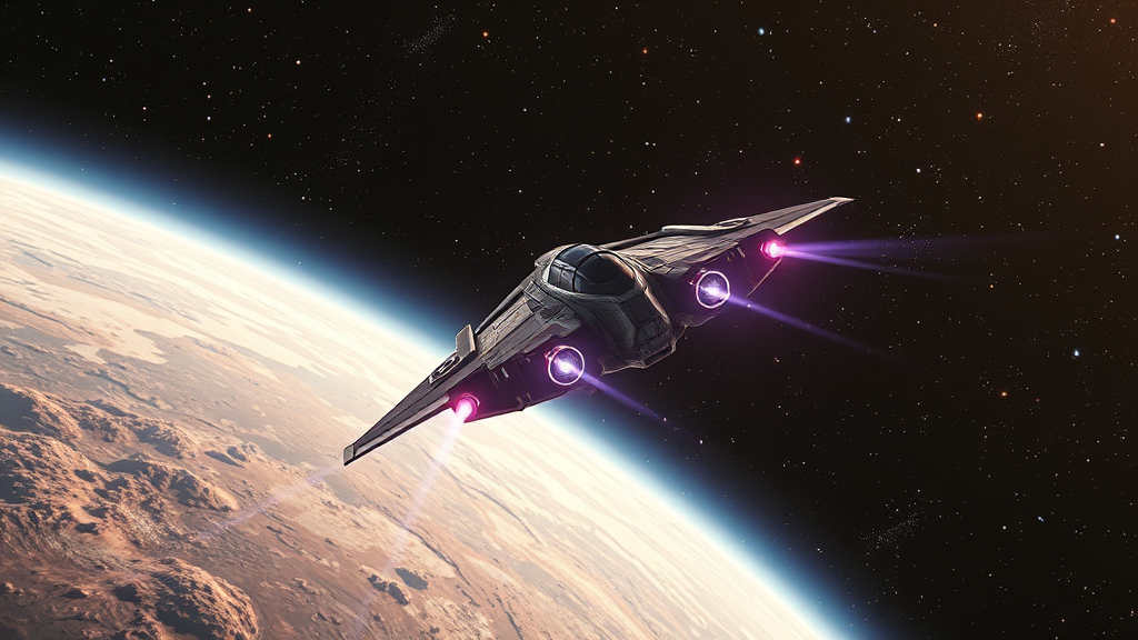 Space fighter soaring through intricate cosmic textures in deep space, exuding a sci-fi aura reminiscent of Chris Foss and Homeworld styles, bathed in soft space illumination. Captured in a dynamic scene that mirrors a cinematic feel from a god's eye angle, the setting is imbued with dramatic colors and enhanced by a distant shot perspective. This digital illustration boasts photorealistic qualities, featuring exceptional detail in an HD, 8K Super-Resolution format, maintaining a sense of awe and wonder through subtle creative shifts while preserving the essence of a spacefaring epic.