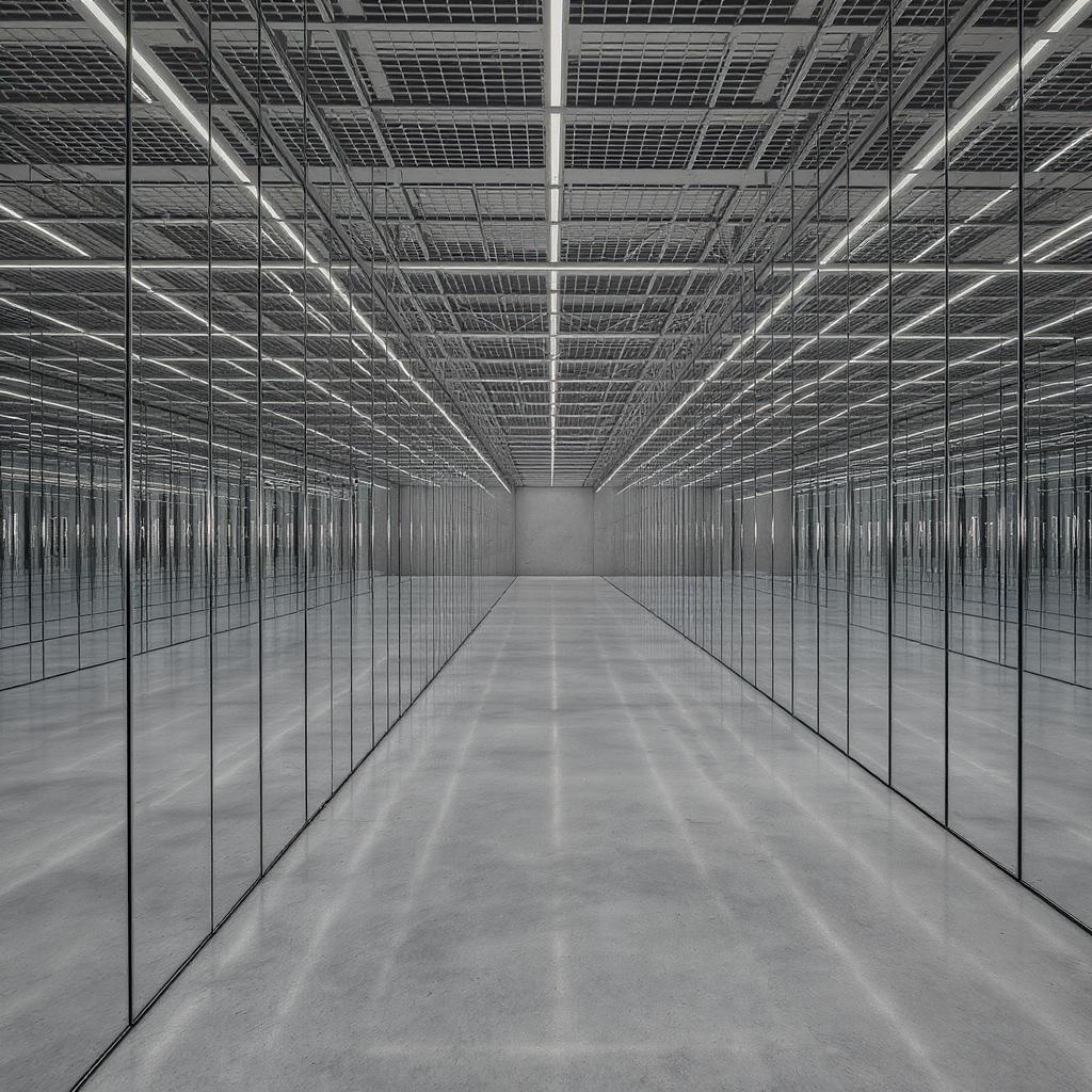 View this AI-generated image featuring a vast space filled with mirrors and intricate metal work embodying minimalist monochrome aesthetics with a grid like precision the environment features clean lines in a palette of dark silver and white accented by smooth concrete surfaces designed as an archit