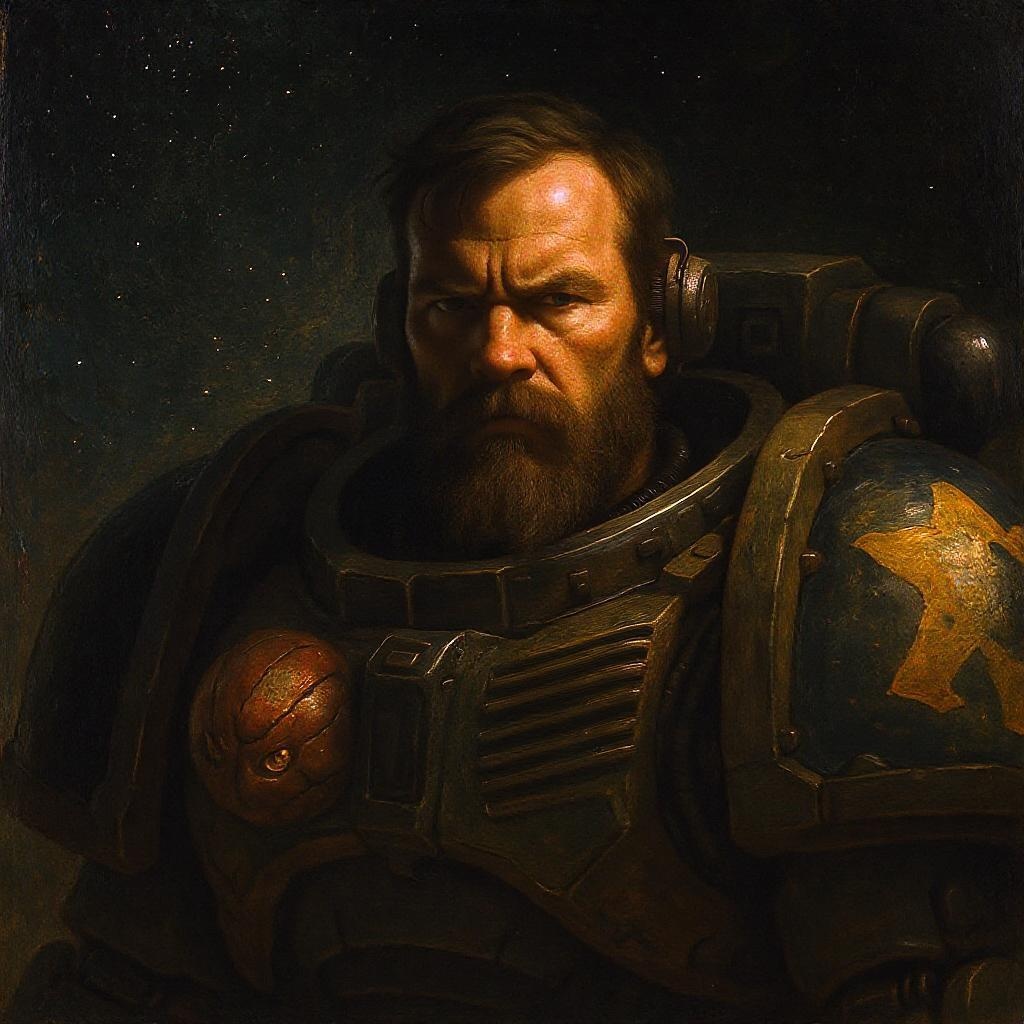 Space marine portrait at midday, featuring intricate biomechanical elements reminiscent of H. R. Giger, yet captured with the rich texture and dramatic lighting of an oil painting by Rembrandt, highlighting stark contrasts and deep shadows, set against a subtly glowing celestial backdrop, emphasizing the marine's determination and strength through a highly detailed and expressive face.