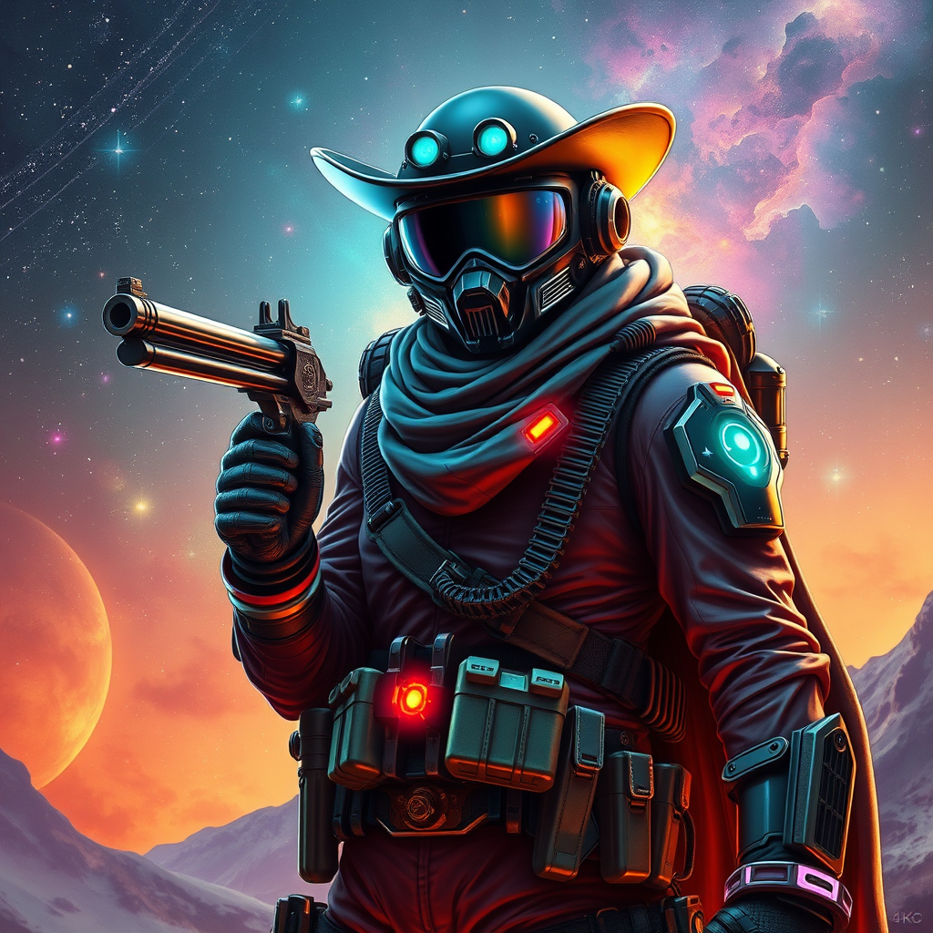 Space ranger with a futuristic western twist, featuring intricately detailed space bounty hunter attire, wielding a plasma revolver and showcasing cybernetic enhancements. Equipped with high-tech gadgets, cast in vivid colors against a cosmic frontier backdrop, this sci-fi western mashup blends steampunk and cyberpunk aesthetics. With breathtaking nebulas as the setting, the scene is expertly illustrated with detailed textures and glowing elements. A dynamic composition creates an epic atmosphere that crosses genres, capturing the essence of a captivating space opera. The ultra-realistic, 4k artwork is infused with a Neo-Noir style, adding a touch of mystery and allure.